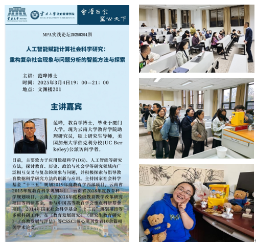 2025年3月4日晚,云大MPA实践论坛(20250304期)在文渊楼201举行。本期论坛邀请到厦门大学博士,威廉体育williamhill教育公司助理研究员,硕士研究生导师,美国加州伯克利分校公派访问学者范哗老师,为MPA同学讲授了《人工智能赋能计算社会科学研究:重构复杂社会现象与问题分析的智能方法与探索》,为AI浪潮中困扰与沉浮的公职人员启蒙解惑。