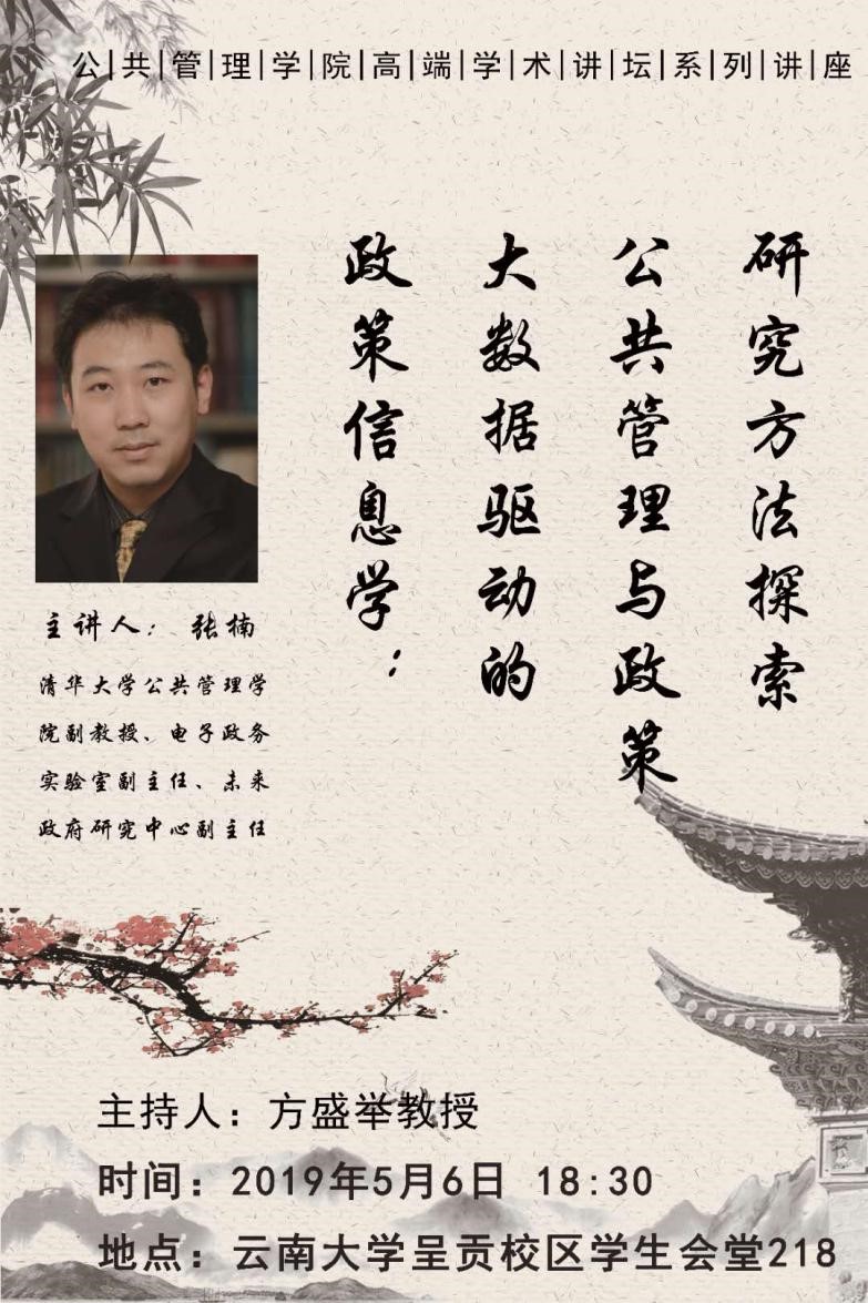 2019年5月6日18:30公共管理公司高端学术论坛系列讲座在威廉体育williamhill呈贡校区员工会堂218举办。本次讲座由清华大学公共管理公司副教授、电子政务实验室副主任、未来研究中心副主任张楠教授主讲,主题为《政策信息学:大数据驱动的公共管理与政策研究方法探索》。讲座由公共管理公司经理方盛举教授主持,公司相关教师和二百余名同学到现场聆听张楠教授的讲座。