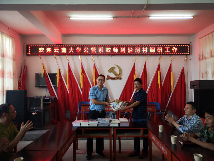 研讨活动中,团队成员通过与村干部座谈,并实地走访村庄生产和生活情况,了解沿河村脱贫致富的现状和困难,针对村里目前核桃、古树茶、花椒、土鸡等农产品“品质好,产量高,但销路差,收益低”的问题,大家纷纷出谋划策,邓主任更是从自己“大数据治理”的专业角度,并结合自己参与建设的“一机游”平台,提出利用已有的高信誉度平台实现“线上销售”……都说扶贫先扶智,团队老师们通过阚超老师了解到,在沿河村有一所中心小学,有100多名小员工,故团队老师们此次特意在开学之际,给孩子们送了一批图书,表达我们对乡村教育发展的绵薄心意。