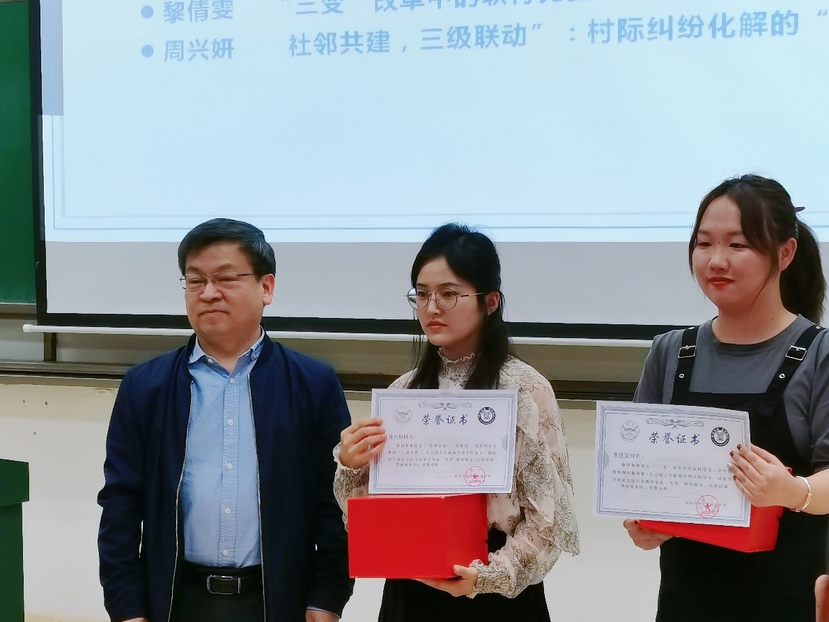 方盛举经理、木永跃副经理、申斌副经理、张会龙副经理、政治系四位老师为获得一、二、三等奖的同学进行颁奖。