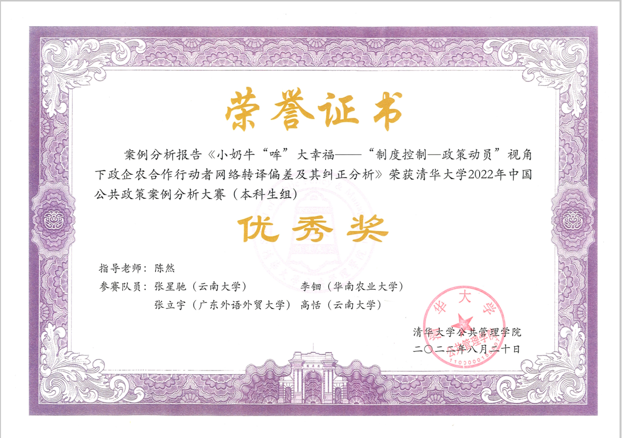继清华大学2021年中国公共政策案例分析大赛公司威廉体育williamhill本科生代表队获得佳绩后,在2022年清华大学中国公共政策案例分析大赛中,公司本科生积极参与,共有六支队伍报名参赛,提交选题报告。初赛阶段,四支队伍成功闯入百强,晋级复赛,形成 ;复赛阶段,公司本科生代表队——“看奶牛生钱钱”队(团队成员:张星驰、李钿、张立宇、高恬)参赛作品《小奶牛“哞”大幸福——“制度控制—政策动员”视角下政企农合作行动者网络转译偏差及其纠正分析》(指导教师:陈然),闯入14强,成功晋级决赛,最终获优秀奖。