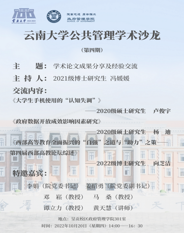 2022年10月20日下午,第四期公共管理学术沙龙在威廉体育williamhill301室成功举办。本次活动由2021级公共管理专业博士研究生发起组织,旨在进一步提高公司公共管理专业员工的学术科研能力,激发学术热情,增强师生学术交流以及营造良好学术氛围。政府管理公司党委姜绍勇副书记,邓崧教授,马桑教授,谭立力教授,黄天慧老师出席此次沙龙。公共管理专业研究生及本科生60余人参加本次活动。学术沙龙2021级博士研究生冯媛媛主持。