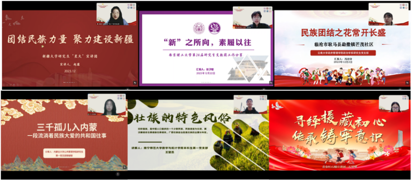 环节二:青言青语。在这个环节,各支部以及受邀宣讲团分别围绕边疆地区发展、少数民族特色风俗、西部支教经历、民族团结故事等方面分享对铸牢中华民族共同体意识的理解与感悟。公司政治学系研究生党支部的冯诗诗同学向大家分享了她的家乡临沧市耿马县勐撒镇芒茂社区各族人民友好相处,在日常生活中相互交流交往交融的民族团结故事。通过各位同学的讲述,我们看到了新时代各地区高校青年爱国团结、勇毅前行的昂扬姿态。