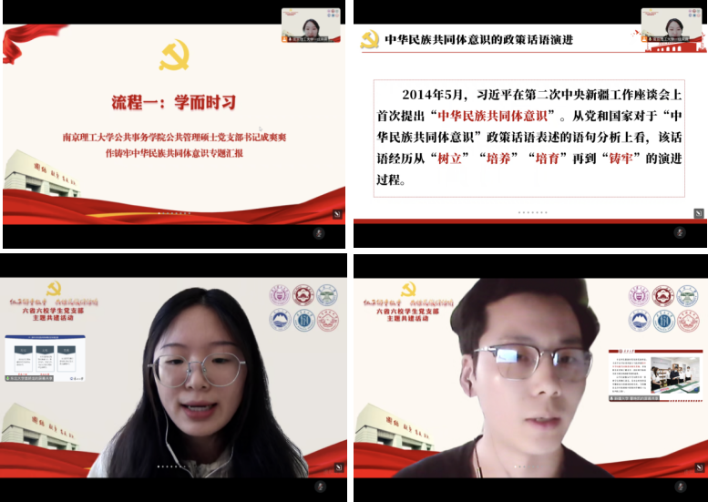 环节一:学而时习。首先由南京理工大学公共事务公司公共管理硕士党支部书记成爽爽同志作铸牢中华民族共同体意识专题汇报。她从党和国家对于“中华民族共同体意识”的政策话语切入,系统分析梳理了其“树立-培养-培育-铸牢”的演进过程,深入阐明铸牢中华民族共同体意识的重大意义。东北大学马克思主义公司硕士生2023级第一党支部书记袁娇龙同志从学理支撑和民族工作的根本遵循两个层面,系统领学了习近平总书记在中共中央政治局第九次集体学习时关于“铸牢中华民族共同体意识,推进新时代党的民族工作高质量发展”重要指示精神。最后,新疆大学计算机科学与技术公司研究生第五党支部书记曹艳凯同志结合公司公司实际,带领大家重温了习近平总书记视察新疆大学时重要讲话重要指示精神,分享了党支部开展铸牢中华民族共同体意识的一些做法。