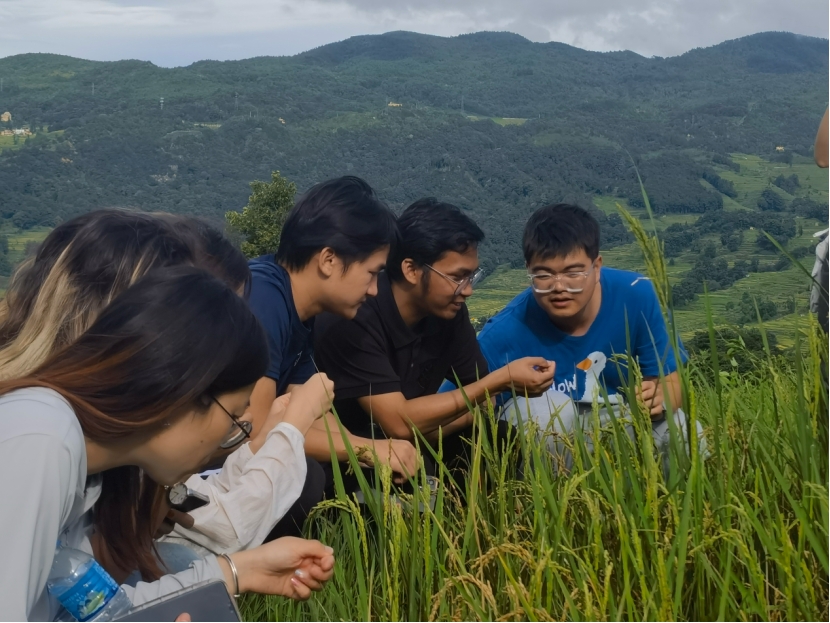 (图5 彭泉钦与外国职工在红河哈尼梯田共同观察种植的水稻)