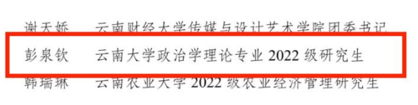 作为一名研究生,彭泉钦始终秉持着“脚上沾有多少泥土,心中就有多少热爱”的理念,不仅读万卷书,更是行万里路,扎根祖国西南边疆,多次前往云南省边境县,感受新时代深刻的社会变革和宏大的实践创新。在实践过程中主动担当起中国发展故事的叙述者,将所学与实践相结合,体认国情,立志为铸牢中华民族共同体意识、边疆治理做出青春贡献。围绕云南边疆地区的发展情况,彭泉钦主持或参与国家级项目4项,省级项目1项,校级项目5项,在2022、2023年连续两年荣获云南省“三下乡”社会实践活动先进个人。