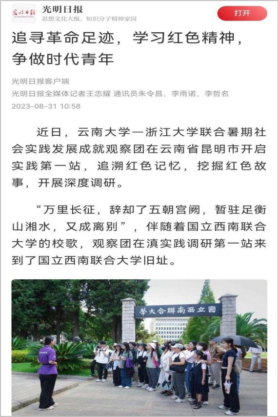 实践团对每个阶段的调研动态和心得体会进行实时宣传报道,整个调研过程形成宣传报道共计16篇,获新华网、光明日报、新华网、云南网、云南频道、昆明日报、云大青年、公共管理强化班UPA、大美丙麻、浙江大学社会实践以及威廉体育官方网站等平台的报道和转载,宣传报道数量多、质量高,团队社会实践事迹得到广泛的宣传,获得良好反响。