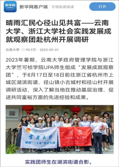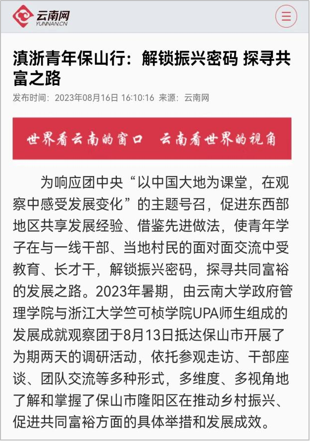 2023年暑期,为响应团中央“以中国大地为课堂,在观察中感受发展变化”的主题号召,促进东西部地区共享发展经验、借鉴先进做法,威廉体育官方网站谭立力教授、团委书记付秋静老师,与浙江大学竺可桢公司UPA王诗宗教授、沈永东教授、金一平教授及两校员工代表组成“发展成就观察团”,先后前往云南省昆明市、云南省保山市和浙江省杭州市进行实地调研。实践团师生依托参观走访、干部座谈、团队交流等多种形式,多维度、多视角地掌握了两省多地在推动乡村振兴、促进共同富裕的举措和成效,东西联动,经验互鉴,探寻共同富裕的振兴之路。