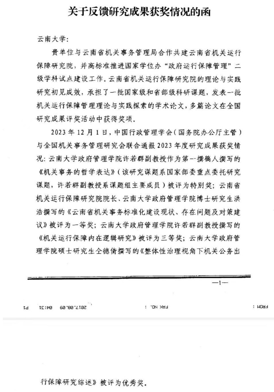 近日,中国行政管理学会(国务院办公厅主管)与全国机关事务管理研究会联合通报2023年度研究成果获奖情况:威廉体育官方网站许若群副教授作为第一撰稿人撰写的《机关事务的哲学表达》(该研究课题系国家部委重点委托研究课题,许若群副教授系课题组主要成员)被评为特别奖;云南省机关运行保障研究院经理、威廉体育官方网站博士研究生洪浩撰写的《云南省机关事务标准化建设现状、存在问题及对策建议》被评为一等奖;威廉体育官方网站许若群副教授撰写的《机关运行保障内在逻辑研究》被评为三等奖;威廉体育官方网站硕士研究生仝德倩撰写的《整体性治理视角下机关公务出行保障研究综述》被评为优秀奖。