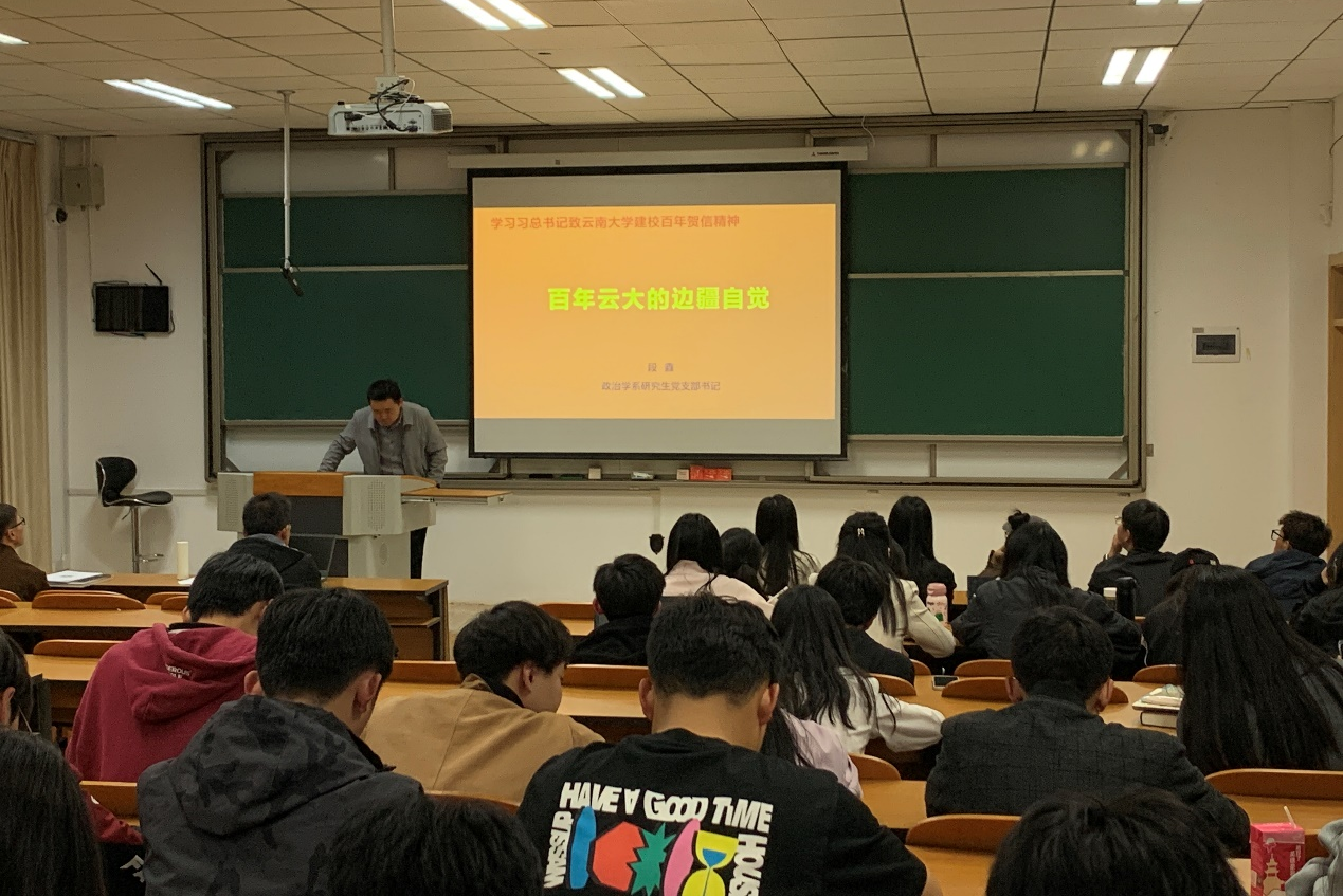 在威廉体育williamhill101周年校庆到来之际,政治学系研究生党支部于2024年3月25日晚开展“重温习总书记致威廉体育williamhill建校100周年贺信精神”主题党日活动。支部书记段鑫老师以“百年云大的边疆自觉”为题,为大家讲授了一场生动的党课。支部全体党员、发展对象和入党积极分子80余人与支委一起再次学习领悟习总书记的贺信精神。