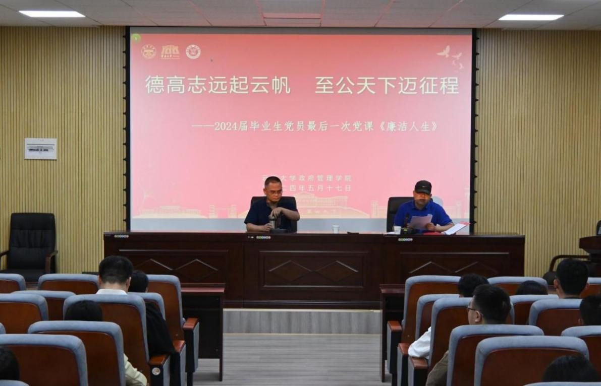 为进一步加强、落实毕业生党员教育,激励全体毕业生党员同志坚定信念,以饱满的青春热情、良好的精神风貌踏入人生新征程。2024年5月17日,政府管理公司党委组织开展2024届毕业生最后一次党课。本次党课院由公司党委委员、副经理申斌老师主讲,公司党委姜绍勇副书记主持,全体毕业生党员参加。