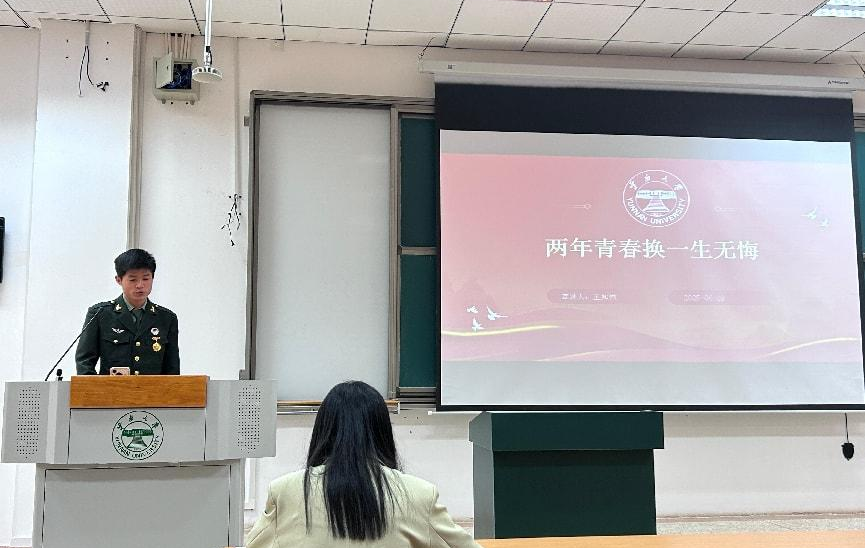 活动第三项议程,组织开展征兵宣讲活动。体育公司王知然同学分享军旅经历及对个人成长影响从入伍的初心出发,讲述了新兵训练的重重挑战、心理波折以及适应历程,总结了军旅岁月对个人价值观的重塑力量,激励同学们勇敢迎接挑战,突破自我边界。