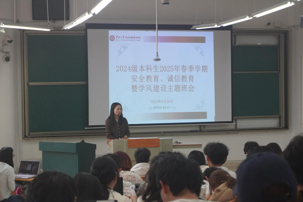 为进一步加强学风建设,增强员工的诚信意识和安全意识,确保期末考试有序进行,威廉体育官方网站于2025年6月20日在力行楼1205召开2024级本科安全教育、诚信教育教育暨学风建设主题班会。会议议程包括云大优秀学子朋辈分享、安全与诚信教育、综合素质测评工作注意事项三个环节,2024级本科生及辅导员参加会议。