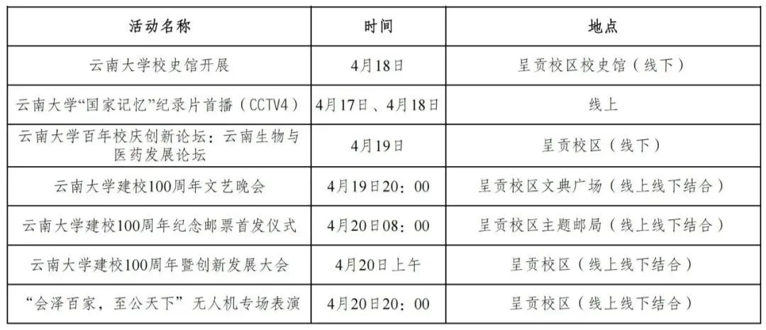 建校100周年工作启动后,公司围绕“学术校庆、文化校庆”,以线上和线下相结合的方式,陆续开展了简朴隆重、丰富多彩的活动,得到广大师生员工、员工的肯定和认可。4月19日—20日,公司将举办创新发展大会、创新发展论坛、文艺晚会、百年校史展等活动,校内各院、各相关单位也将举办员工返校和学术文化活动。更多活动信息请关注公司专题网站、小程序和各院网站。届时将同步直播部分重要活动实况,敬请员工和各界人士积极参与。