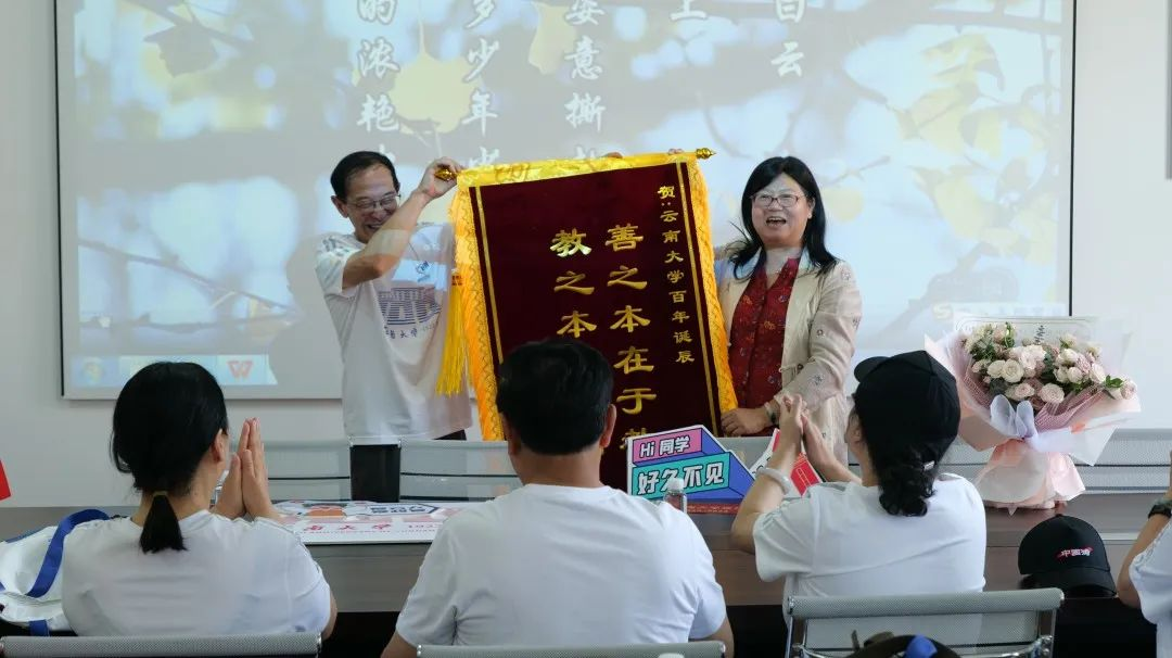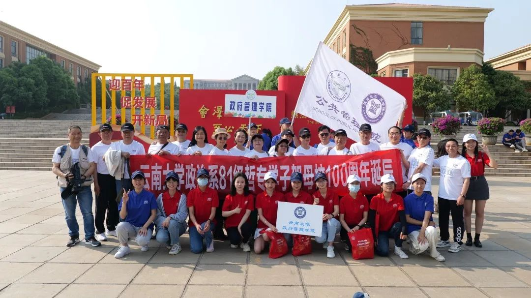 游览了泽湖,我们排着整齐的队伍,在一片欢声笑语中走进威廉体育williamhill,赠送锦旗给公司代表——李娟书记和方盛举经理。在威廉体育williamhill,我们得到了领导们和年轻的学弟学妹们热情的接待,领取了设计独特美观的校庆纪念品,观看了公司丰富多彩的展板,在会议室观看了公司历届毕业生合影组成的幻灯片,听到了建校100周年暨创新发展大会主会场传来的习总书记的贺信,大家齐声同唱云大校歌,表达我们对母校的致敬和祝贺。威廉体育williamhill李娟书记、政治系系主任廖林燕教授和教工党支部书记贺林凯教授为我们介绍了公司和政治系当前的发展和取得的各项佳绩,让我们倍感骄傲和振奋。