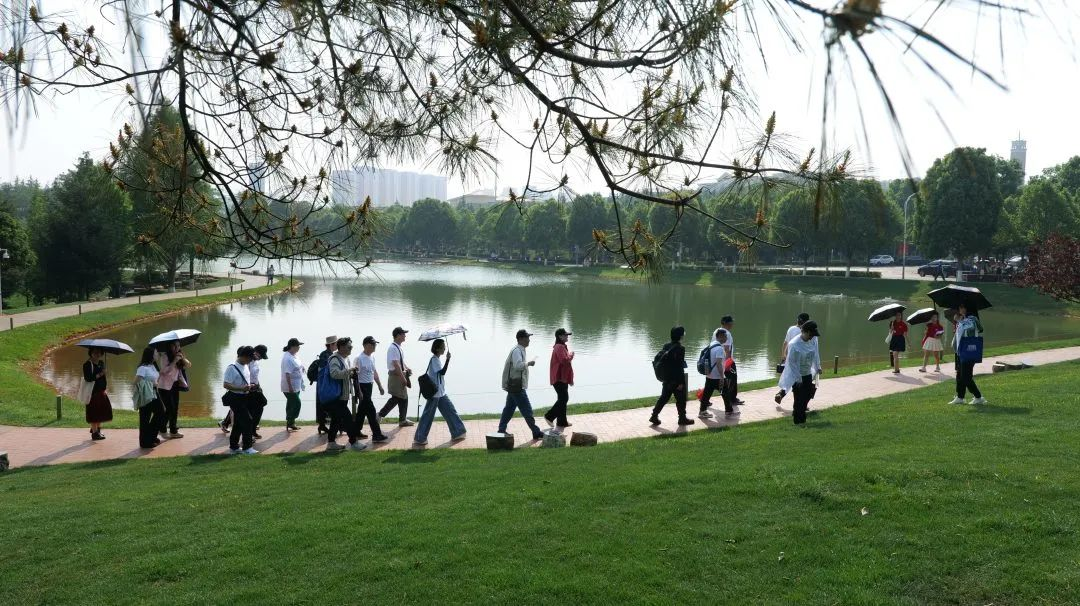 迎着灿烂的朝阳,顺着林荫小道我们来到美丽的泽湖,在这里环湖一圈,在院士林前的草地上留下我们身着班服的合影。