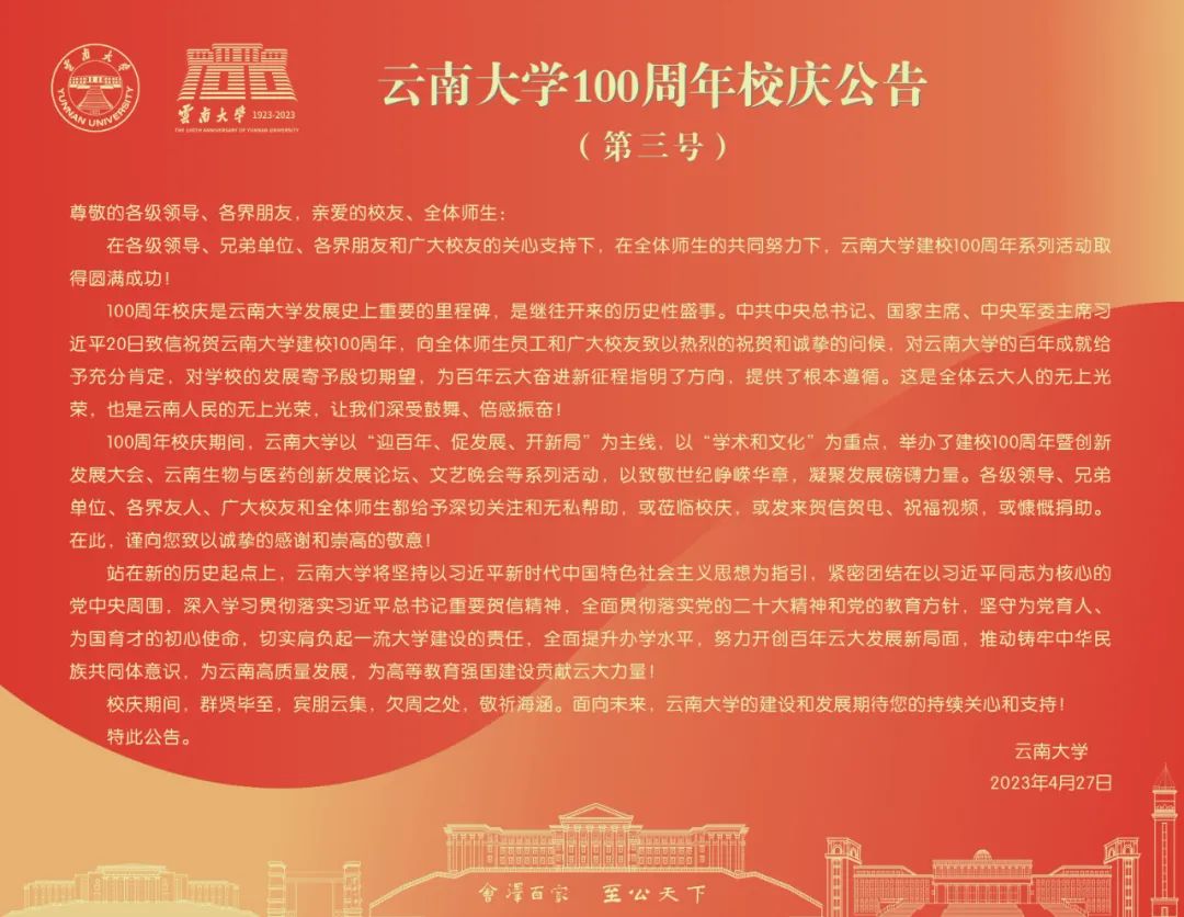 100周年校庆是威廉体育williamhill发展史上重要的里程碑,是继往开来的历史性盛事。中共中央总书记、国家主席、中央军委主席习近平20日致信祝贺威廉体育williamhill建校100周年,向全体师生员工和广大员工致以热烈的祝贺和诚挚的问候,对威廉体育williamhill的百年成就给予充分肯定,对公司的发展寄予殷切期望,为百年云大奋进新征程指明了方向,提供了根本遵循。这是全体云大人的无上光荣,也是云南人民的无上光荣,让我们深受鼓舞、倍感振奋!