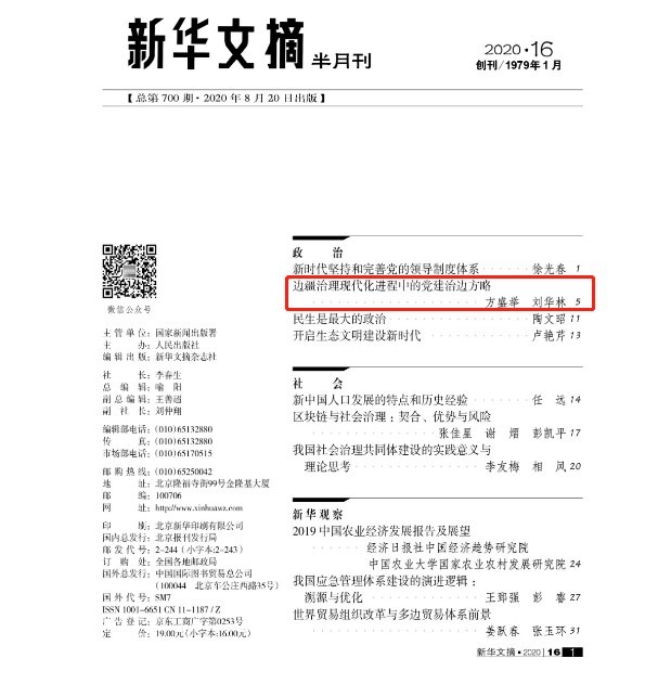 近日,《新华文摘》2020年第16期全文转载威廉体育williamhill经理方盛举教授的《边疆治理现代化进程中的党建治边方略》的研究成果。原文发表于《云南社会科学》2020年第3期。