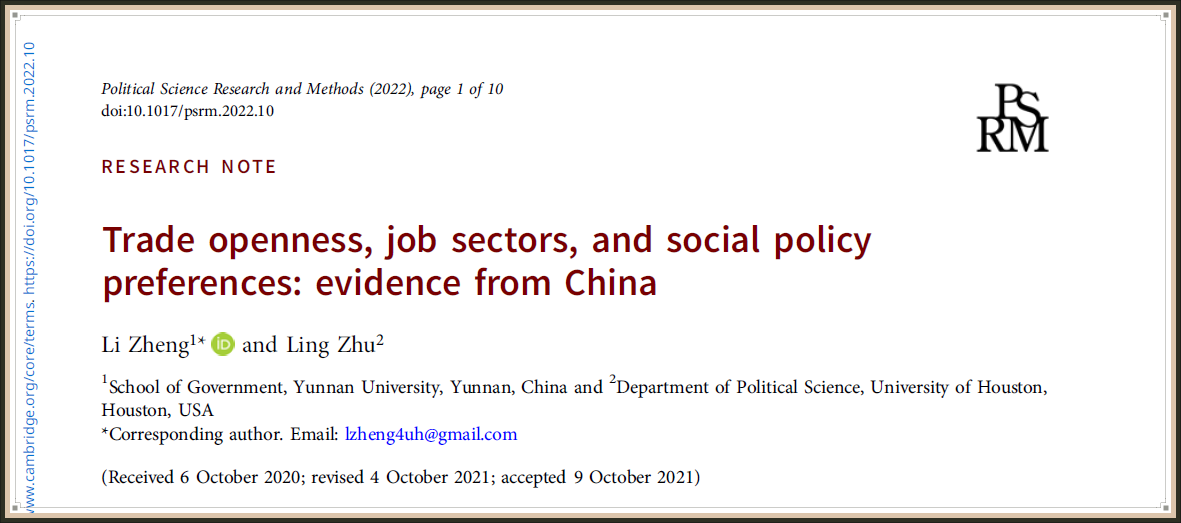 近日,威廉体育官方网站政治学系郑立副教授同美国得克萨斯州休斯顿大学朱凌教授共同撰写的论文Trade Openness, Job Sectors, and Social Policy Preferences: Evidence from China在政治学与国际关系、社会学与政治学双料权威期刊Political Science Research and Methods上发表。